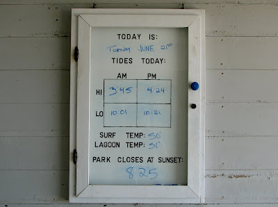 Glance at the day board to determine tides, times, and water temperatures. (Note that the surf this day was 50 degrees.)